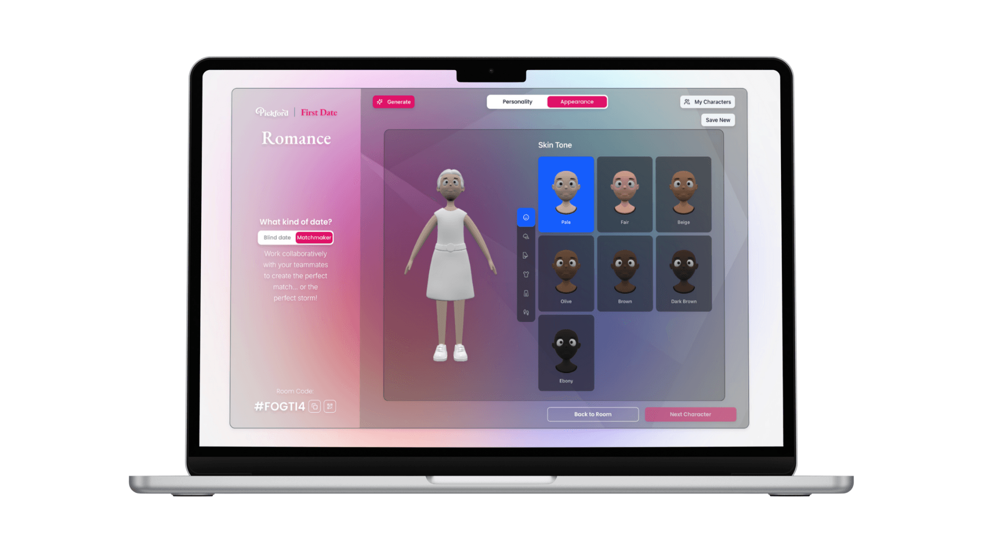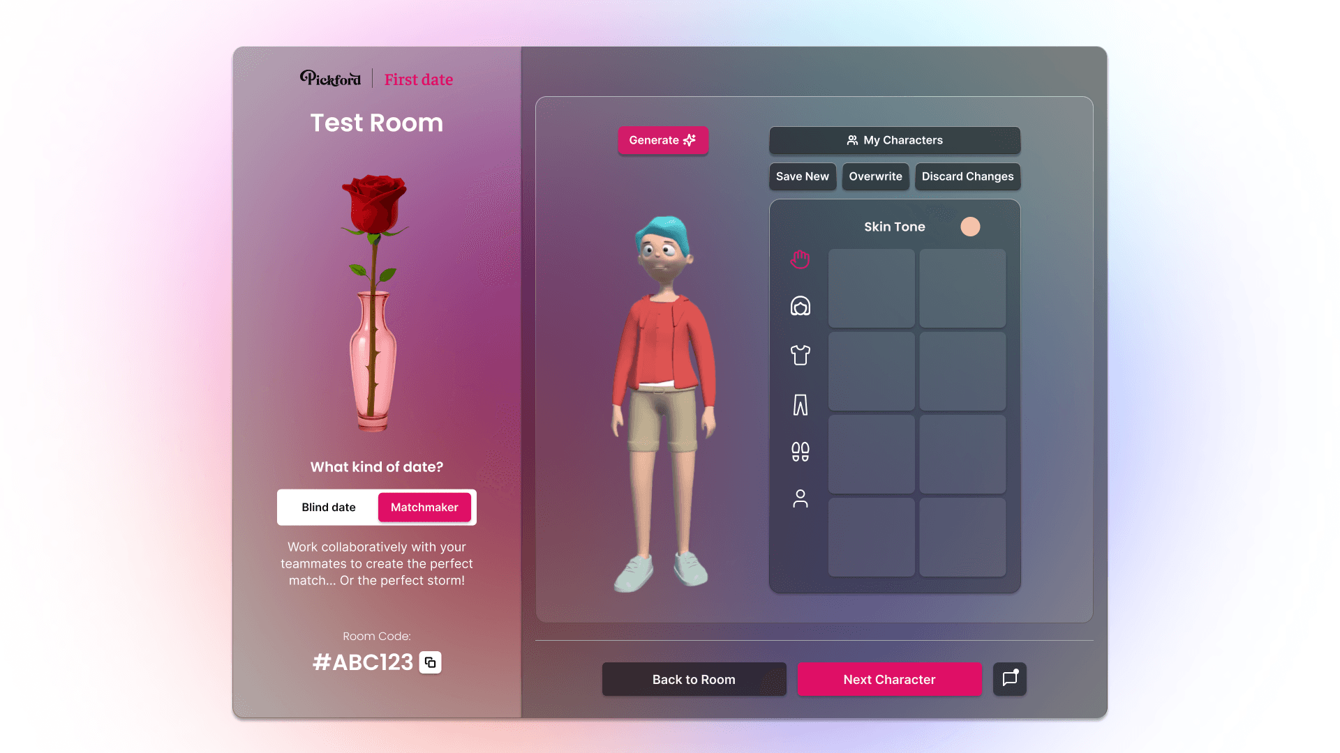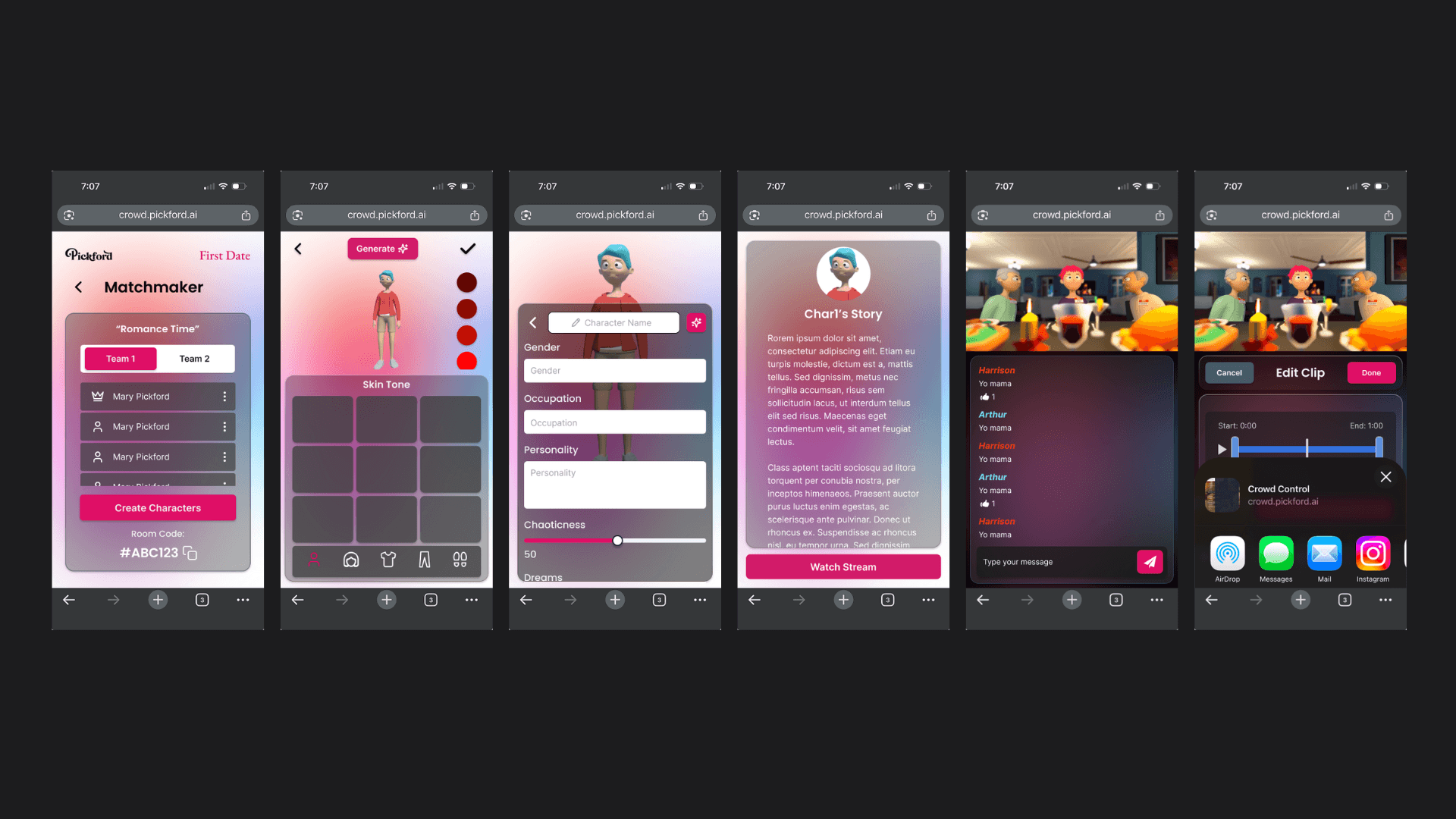 Pickford AI's early environment, First Date, lacked key features and required significant visual refinement to meet the platform's vision. The main challenge was designing the core experiences, specifically the Character Builder and Live Viewing screens. Over the course of the project I'd also need to design the web app's homepage that would act as the hub for users to navigate diverse experiences, characters, and shared clips from the res of the community.