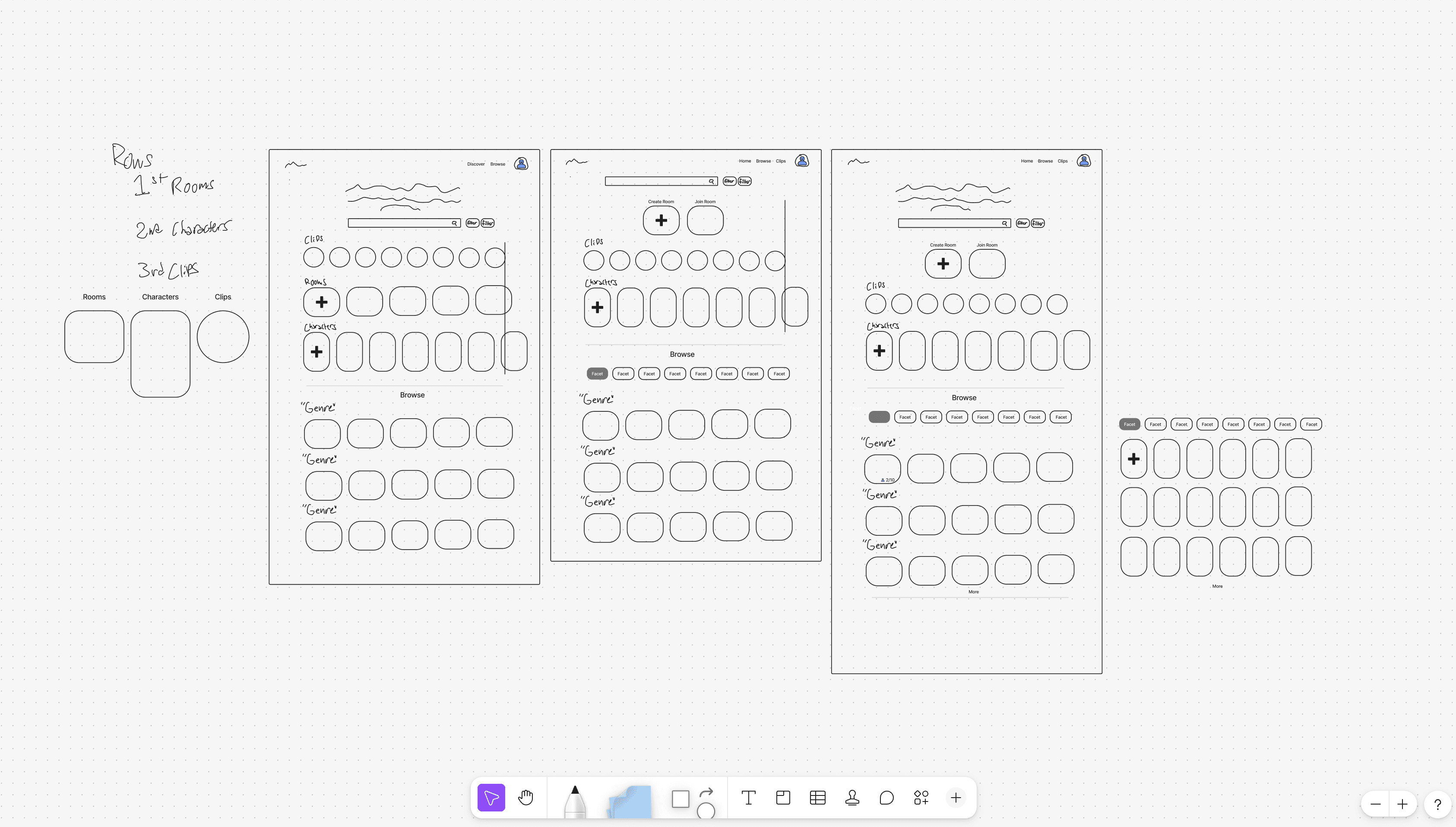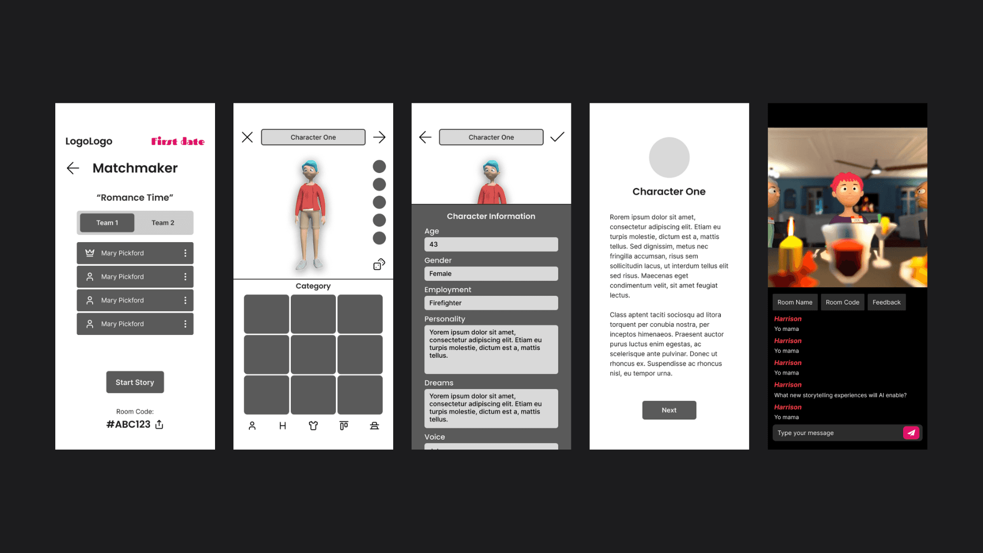 Working from product requirements and the existing platform iteration, I designed the Player Lobby, Character Builder, and Live Story screens. I sketched some low-fidelity wireframes to establish the information architecture for these primary flows, making sure it fit the vision before moving forward. Phase 1 concluded with the high-fidelity design of the Live Viewing Screen, giving the team a visual interpretation of being able to chat with friends while watch the experience in real-time.