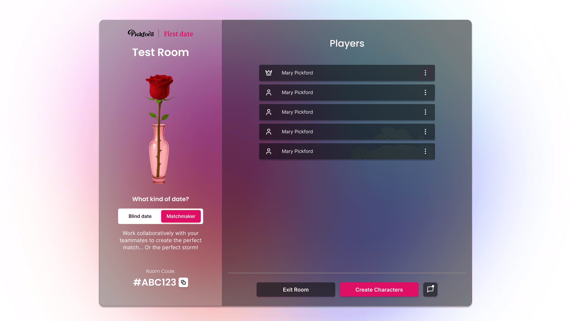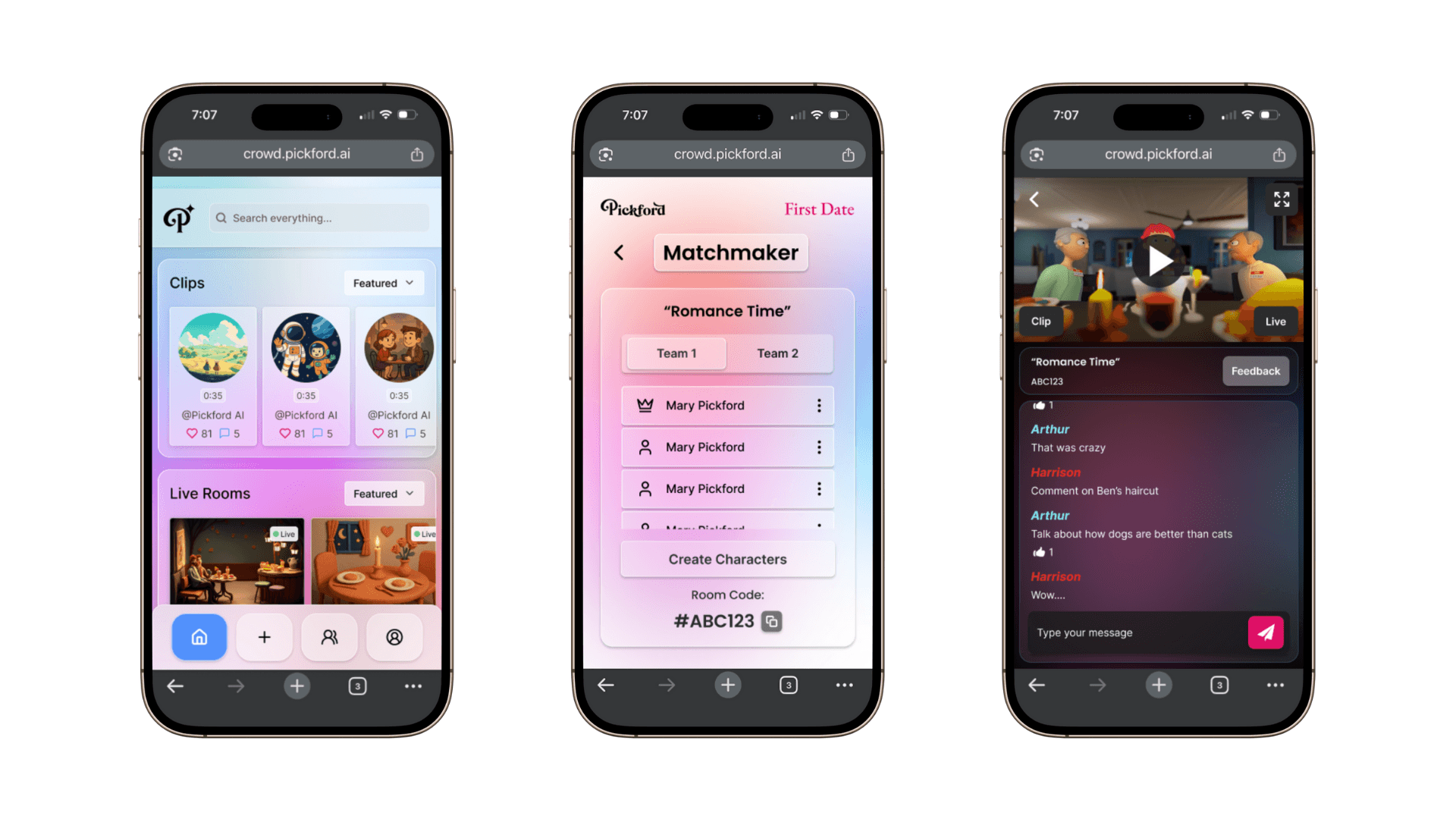 Pickford AI's social storytelling platform is designed to make collaborative world-building simple, accessible, and creatively empowering. Their first environment First Date, is an early look into the vision for the future of human-computer interaction as a form of storytelling. Inspired by platforms like Fortnite, Roblox, and Character.ai, the web app's redesign had the goal of creating a clean entry point that highlights creativity while maintaining visual consistency across mobile and desktop.